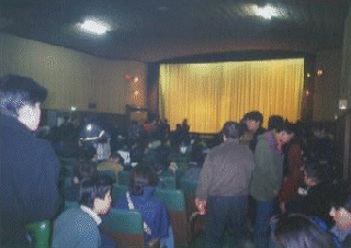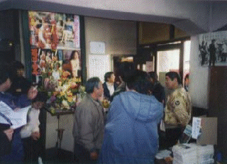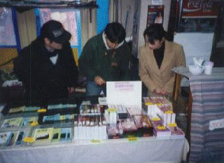 売店。最終日は(も?)有志の方々が店番を勤めていました。売っているのは、成人映画のビデオや情報誌がメイン。ポットに入ったコーヒーの湯気が目に染みた。 |