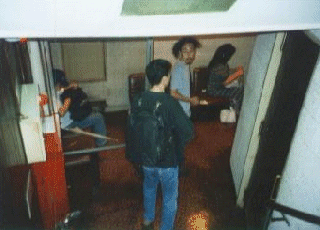 階段下は喫煙所兼休憩所。右手に二つ扉があり、その中が映画館となっていました。 |