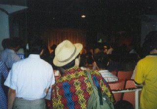 階段下は喫煙所兼休憩所。右手に二つ扉があり、その中が映画館となっていました。 |